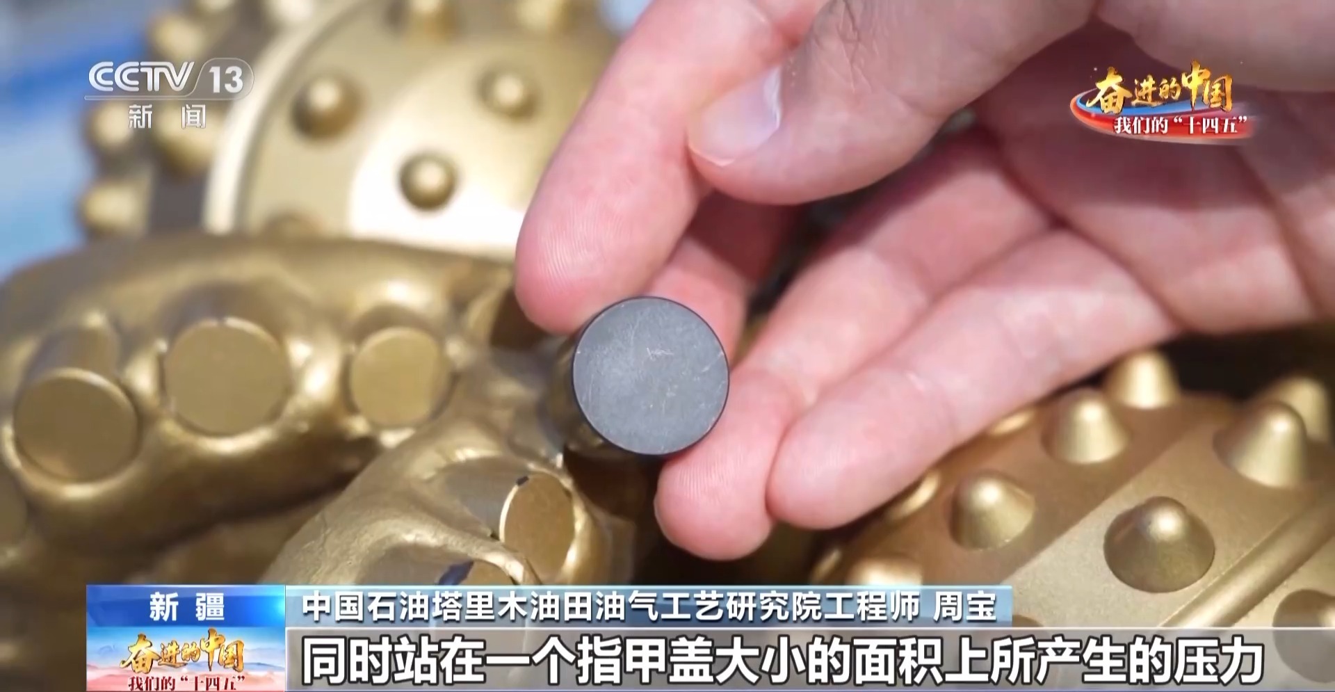 中石油塔里木油田油气技术研究院工程师周宝:这是我们公司自主研发的钻头。核心材料是在1500摄氏度的极端条件下制造的,两个80000个大气压,相当于八头10吨重的大象同时放置在高压下产生的压力。呃,指甲盖大小的区域。